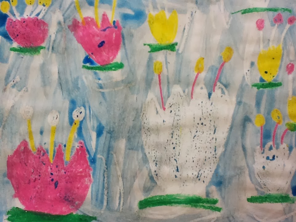 First grade learned a little bit about Claude Monet and impressionism. They used oil pastel and watercolor to create this one. We discussed line, shape, and depth.